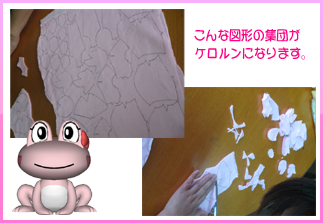 この型紙を組み合わせて、綿をつめると・・・ケロルンになっちゃうんです!
