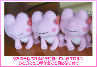 ぬいぐるみの目は通常、刺繍で表現するのが通例ですが、どうしてもケロルンの愛らしさの表現に事欠いたため、フェルト重ねの手法にて目をよりはっきり表現する方向で再現しました。