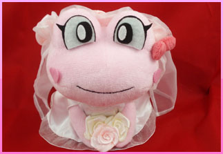 目の位置は仮止めの状態の写真です。ケロルンにウェディングドレスを着せました。ウェディングバージョンのぬいぐるみは数多く作成しておりますが、カエルのバージョンは今回初めて作成しました。ウェディングドレスもかわいらしく出来たと思います☆