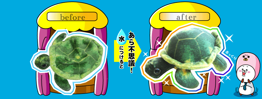 ①水の中にいれる ②お好みの太さになるまで置いておく ③表面の水を軽く拭き取る ④完成! ⑤水分が蒸発すると痩せてくる ⑥何度でも膨らみます