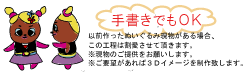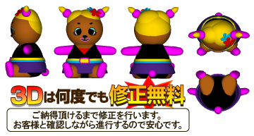 完成イメージが想像しやすい3Dが出来上がりましたら、メール添付にてお客様に確認をして頂きます。3D画像より実際のぬいぐるみの型紙を作成しますので、 この3D画像がほぼそのままぬいぐるみの形になるとお考え下さい。 ※ただし、ぬいぐるみは中に綿を入れますので角や面は多少膨らみがでます。しかしながら、その柔らかさがぬいぐるみの特性でもあります。 また、輪郭は手で整えることもできます。 フィギュアのような成型物ではありませんので 100% 3Dの形どおりにぬいぐるみとして再現できない部分が どうしてもあることを、ご理解頂けましたら幸いです。 |
